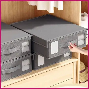 IKEA has affordable fabric boxes that look cute in photos, but they collapse under weight and lack any dust protection.